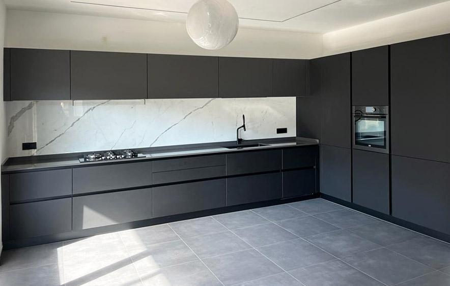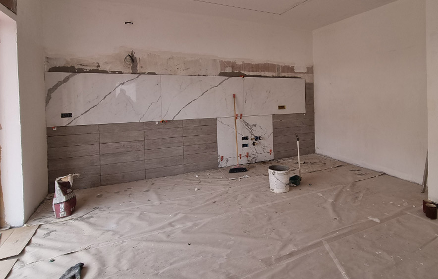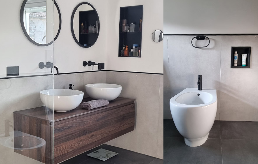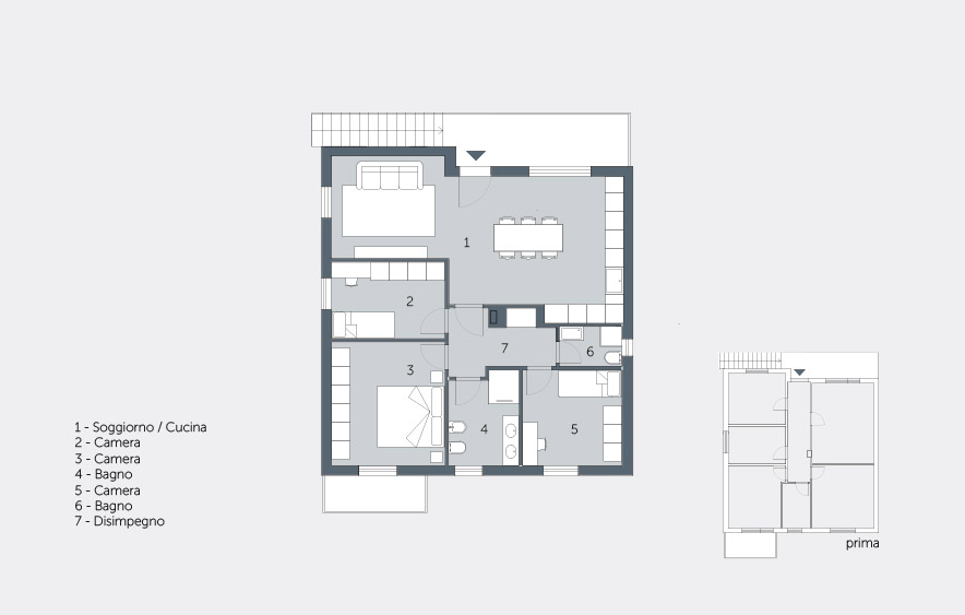 Una casa unifamiliare con giardino della seconda metà degli anni ’60, passata di padre in figlia, distribuita su due livelli con l’abitazione sita al primo piano. L’ ingresso dava su un lungo corridoio che conduceva ai diversi ambienti e ad un bagno. La necessità dei proprietari era quelle di dare nuova vita all’abitazione, cucendola su misura per le loro esigenze, creando una grande zona giorno aperta con una cucina importante e una zona notte separata, con una camera matrimoniale e due singole di egual dimensione. è stato anche aggiunto un secondo bagno e una nicchia con armadio che funge da ripostiglio. Il progetto ha modificato radicalmente la planimetria originaria. Gli ambienti sono stati infine uniformati con una pavimentazione in gres effetto cemento color antracite che corre in tutta l’abitazione.